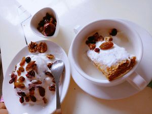 麦片可以加酸奶也可以加纯牛奶,放点干果葡萄之类的水果也很好吃哦!
