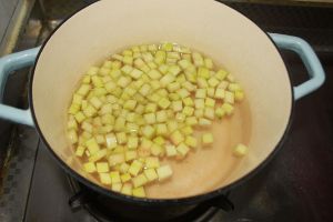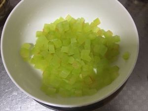去好皮和瓤的西瓜切成比黄豆略大一点儿的小丁。坐小锅烧水,把西瓜皮丁放入开水中焯两分钟左右,尽量要多焯一会儿,一个是可以去掉西瓜皮的生生的味道,焯时间长一点儿西瓜皮也就略软了,有了冬瓜的口感。