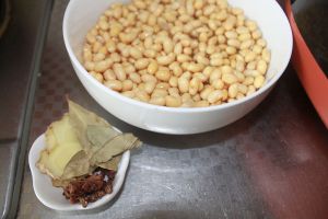 准备花椒,大料,八角,香叶连同泡好的黄豆和水一起加高压锅中,水量不要太多,没过黄豆即可。加入一小勺糖和两小勺盐调味。