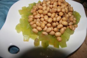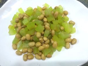 豆子煮好后在一边放凉,其实黄豆可以一下多做些,可以放保鲜盒保存两三天,吃的时候加冬瓜,西瓜皮之类的拌一拌就好。