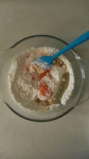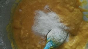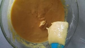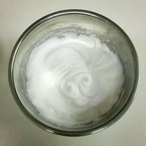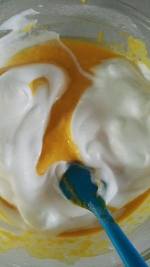 先取三分之一蛋白和面糊搅拌,然后再倒入剩下的三分之二蛋白搅拌