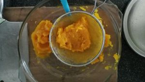 用面粉筛和橡皮刮刀过滤面糊,这一步是充分保持蛋糕的口感松软