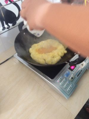 锅里放油烧热后倒入搅拌均匀的鸡蛋,炒香后铲出待用。
