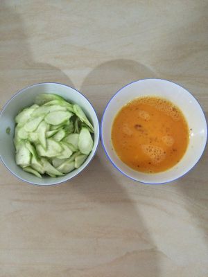 丝瓜切片(喜欢吃什么形状的就切什么形状吧),鸡蛋打出来加入草果面和盐搅拌均匀。