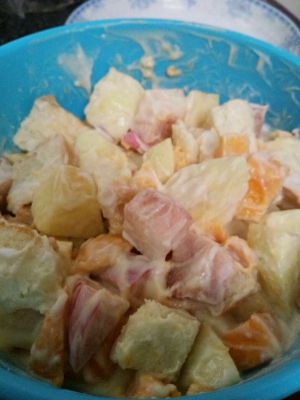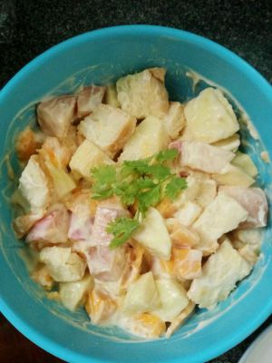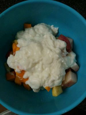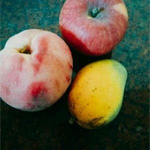 将苹果、芒果和水蜜桃分别切成小块放在碗里