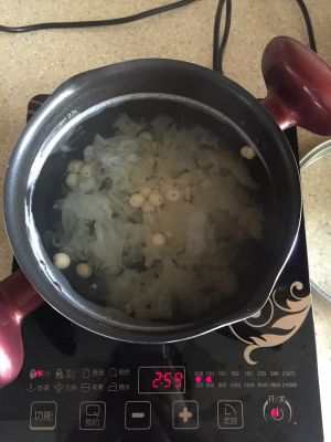 将银耳和莲子放入煮锅中 中火慢炖 直至银耳出胶 变粘稠