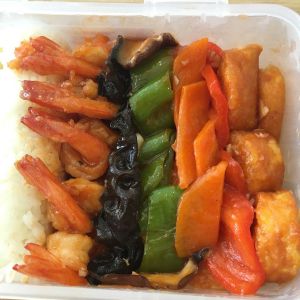 日本豆腐沾干淀粉油炸,虾仁过油成球,青红椒和胡萝卜,香菇过油。热油葱姜炝锅,倒入番茄沙司,加入白糖,白糖多放一些,煸炒片刻,加入眼和少许热水,把所有的菜倒进去翻炒,直到收汁,撒上蒜末,盛盘。这个过程其实挺快的,多放一些油,反而不费油,而且高温炸这些食材使得出菜速度很快的。几乎是一气呵成的完成。反而最耗时的是切菜啦。
