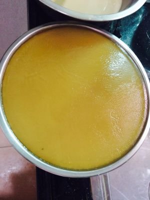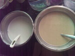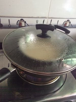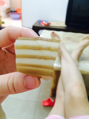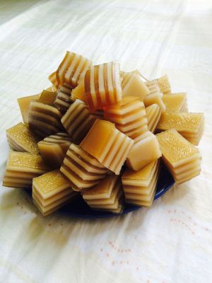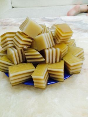 锅里烧开水,拿个不锈钢盘子,舀入黄色浆糊。入锅蒸两三分钟后,在舀入白色椰浆糊继续蒸三分钟。就这样循环蒸至浆糊没有为止。然后出锅放凉后在切块