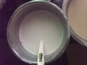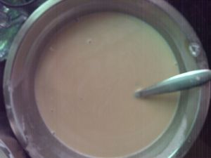 把椰浆倒入锅里,然后倒入一半已经搅匀的马蹄粉糊。(一半哦)这是椰浆马蹄粉浆