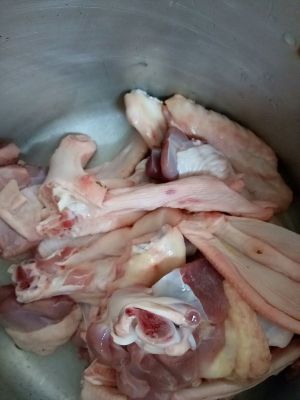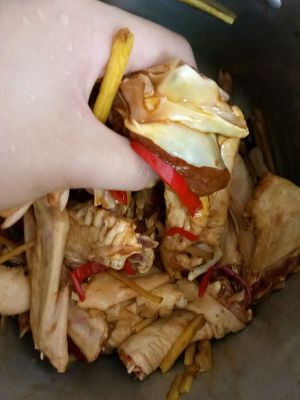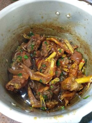 将辣椒,生姜,蒜,酱油倒入装鸭肉的高压锅中抓拿。之后放置阴凉处腌制30分钟。