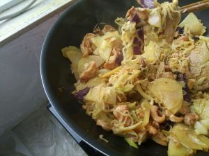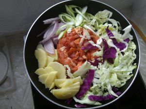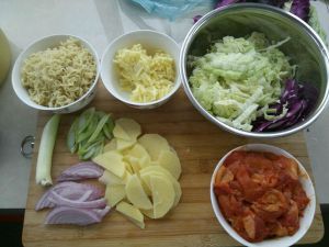 2.将土豆、洋葱、葱切片,圆白菜紫甘兰切丝!