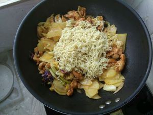 6.等锅内食材九分熟时加入方便面,加入适量的盐,翻炒!