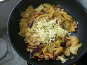7.最后加入芝士,翻炒,待芝士全部熔化后就可以出锅啦!