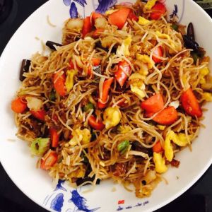 在充满葱姜蒜香味的油中加入沥干的面条,加适量盐和少许酱油翻炒片刻,加入已炒好的鸡蛋、葱姜蒜、火腿肠和其它配菜翻炒即可。