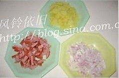 下入火腿片、土豆片,略炒
