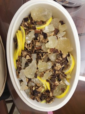 加入一半冰糖,铺上柠檬片,再盖 上剩余的冰糖,陈皮洗净,用烤箱烘干,掰开,放入锅内盖上盖子隔水炖