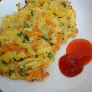 接下来把玉米粒,胡萝卜丝,土豆丝以爱加入面粉中和水搅拌均匀