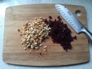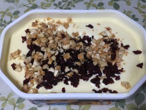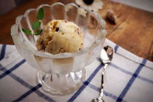 连续搅拌5次左右后再冷冻一小时左右,将蔓越梅和果仁碎倒入盒中用勺子搅拌均匀。