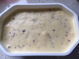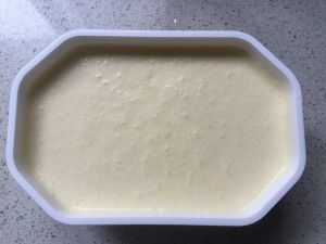 将做好的冰淇淋倒入盒中,放入冰箱冷冻室。每半小时拿出来搅拌一次。连续搅拌5次左右。