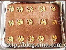 烤箱预热180度,将面糊倒入模具内,表面抹平,撒上核桃,放入烤箱中烤三十分钟即可。