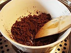 把盛有巧克力碎的碗放到蒸锅上,利用蒸汽将巧克力融化;(也可将巧克力放入大盘内,将大盘置于盛有开水的小盘上融化巧克力,底部不得与开水接触)