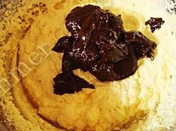 将融化的巧克力稍稍放凉后,倒入奶油糊中,搅拌均匀;