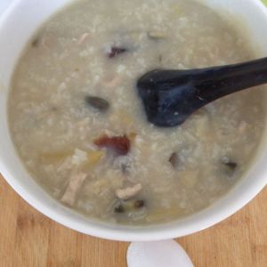 小火慢炖,中途把浮沫和熬出来的黏稠的部分撇出去,可以减轻一定程度的腥味,然后加白胡椒粉,当水分明显少了以后,加剩下的皮蛋,再加点盐调味即可出锅,这里有个窍门,可以离锅远一点闻,一开始会有腥味飘出来,待没有腥味飘出来就成功了