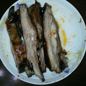 放上胡椒粉,孜然,葱,姜,老抽,料酒,盐,糖,建议准备一次性手套去抹均匀,因为粉粉会进入指甲里,很不舒服,也会。