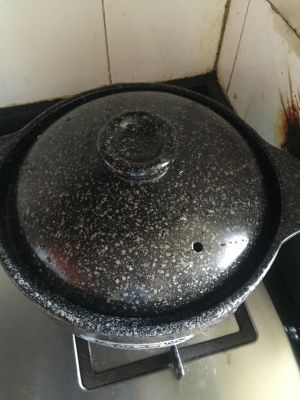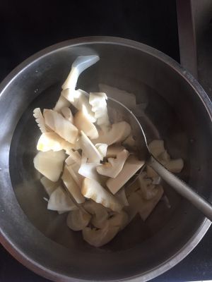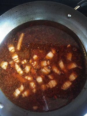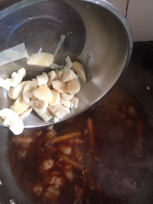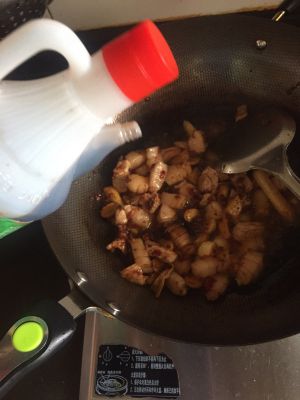 倒入猪肉煵干水汽,加生抽丶白糖煸炒至肉上色,肥肉微微出油
