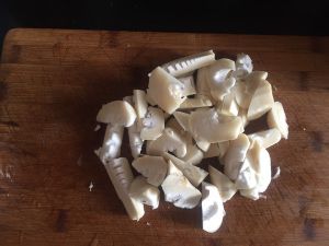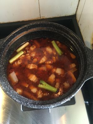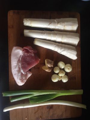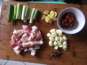 猪肉切成约2cm大小的方块,姜切片,蒜切成块,大䓤切段,小䓤切成䓤花备用