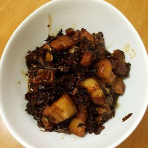 重新倒入锅里收汁调味。梅菜已经有点咸了,不需要加盐。