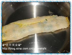 蛋液半凝固的时候卷成卷,两面煎至金黄: