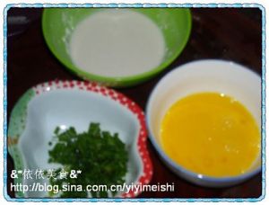 面粉加水、盐、淀粉调成面糊,鸡蛋打散成蛋液,葱切成葱粒: