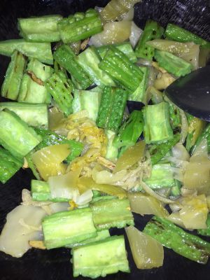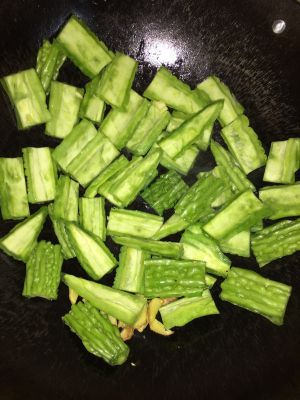 炒至苦瓜转青绿色,表面有点焦褐色,加入咸菜