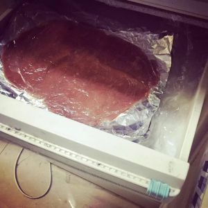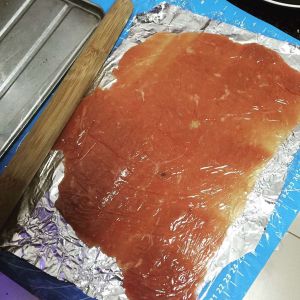 拿张与烤箱大小的锡纸,用刷子抹油、放肉再放一层保鲜膜,杆平。