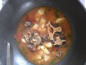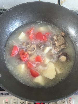 2小时左右,锅里汤汁已经开始收了,放入番茄土豆,大火烧开,小火慢炖半个小时~