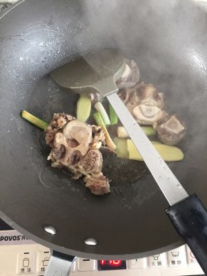 油7成熟,入姜葱,翻炒后入牛尾巴,锅里翻翻~