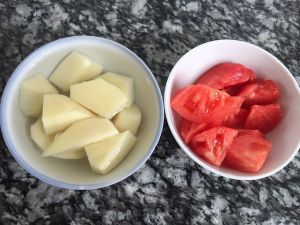 土豆番茄滚刀切,土豆泡水中,防止变色,吐淀粉~