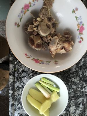 捞出牛尾巴,热水冲洗干净,姜葱切大段,准备入油锅啦
