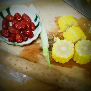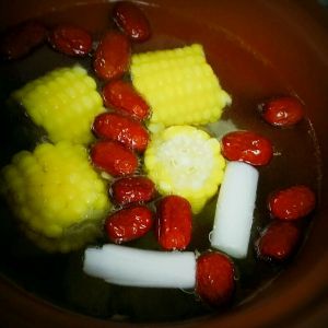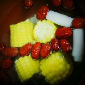 锅里的水沸腾30分钟左右,放入备好的玉米,红枣(嫌麻烦也可一次放入除山药以外的所有食材),盖好炖。