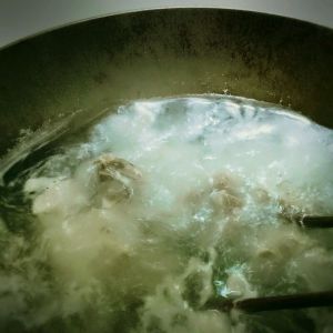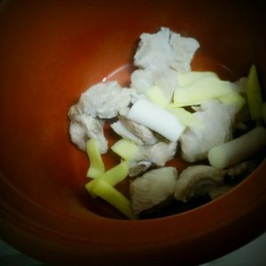 将绰过水的排骨和姜,葱一同放进紫砂锅,注入足量开水(我注入了砂锅3/4的开水)煮炖,高火档。