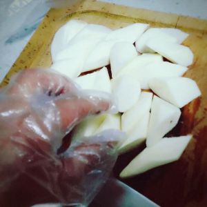开始准备山药,收拾山药要小心,尽量不要碰到皮肤,否则痒得很(我带着一次性手套)。削皮洗净,切成滚刀块若干。