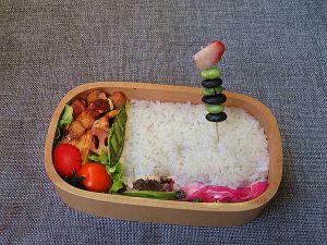 准备好干净的便当盒,下面先铺好生菜,然后把事先准备好的炒菜整齐的码在饭盒的三分之一部分,另外三分之二部分下面放好菜,然后铺上适量米饭把菜掩盖住,紫甘蓝用少许白醋盐泡过以后和切片的香菇一起放在边上装饰点缀,煮熟的黑豆和青豆一起用牙签串起来