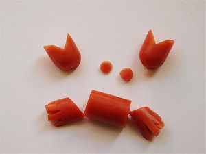 火腿肠要想红的好看,可以放进烤箱烤几分钟上色即可,而且烤过的火腿肠也很好吃。烤过的火腿肠切成4段,其中两头稍短一些