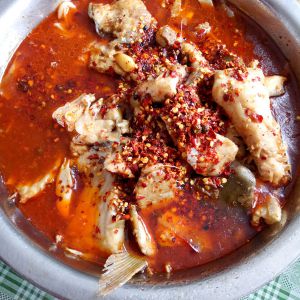 煮熟后放盐,鸡精,然后将鱼锅浇在青菜上边,在准备辣椒面,起锅烧油,油开后将油淋着辣椒上。OK.想喷喷的鱼锅好了。