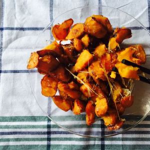 因为今天的地瓜不是很好,所以没法炸到周边都酥酥脆脆的就都已经快发褐色了,不是金黄色了。