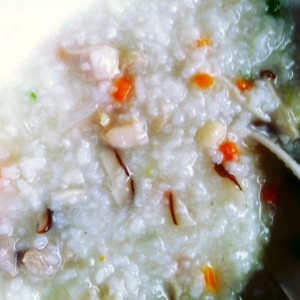 给粥调味,盐,糖,味精,根据自己口味,加少量白胡椒。最后下入鸡丁,用勺子划开,一分钟左右粥就好了,撒点葱花,滴点香油。OK!