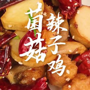 倒入炸好的菌菇和鸡块翻炒,最后撒上花椒粉、少量盐、葱段,出锅前撒上芝麻