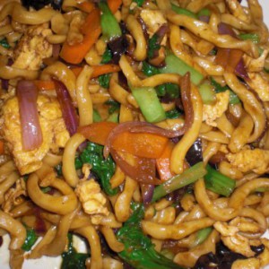 起锅热油,先下洋葱翻炒片刻,然后依次下香菇、胡萝卜、黑木耳翻炒3分钟,然后下鸡毛菜翻炒片刻后倒入面条、自配酱料、老抽翻炒1分钟后放入炒鸡蛋继续翻炒。