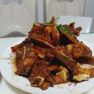 起锅烧油放入冰糖!放入冲洗干净的猪肋排!炒至微微焦黄!放入料酒姜八角!炒出香味!